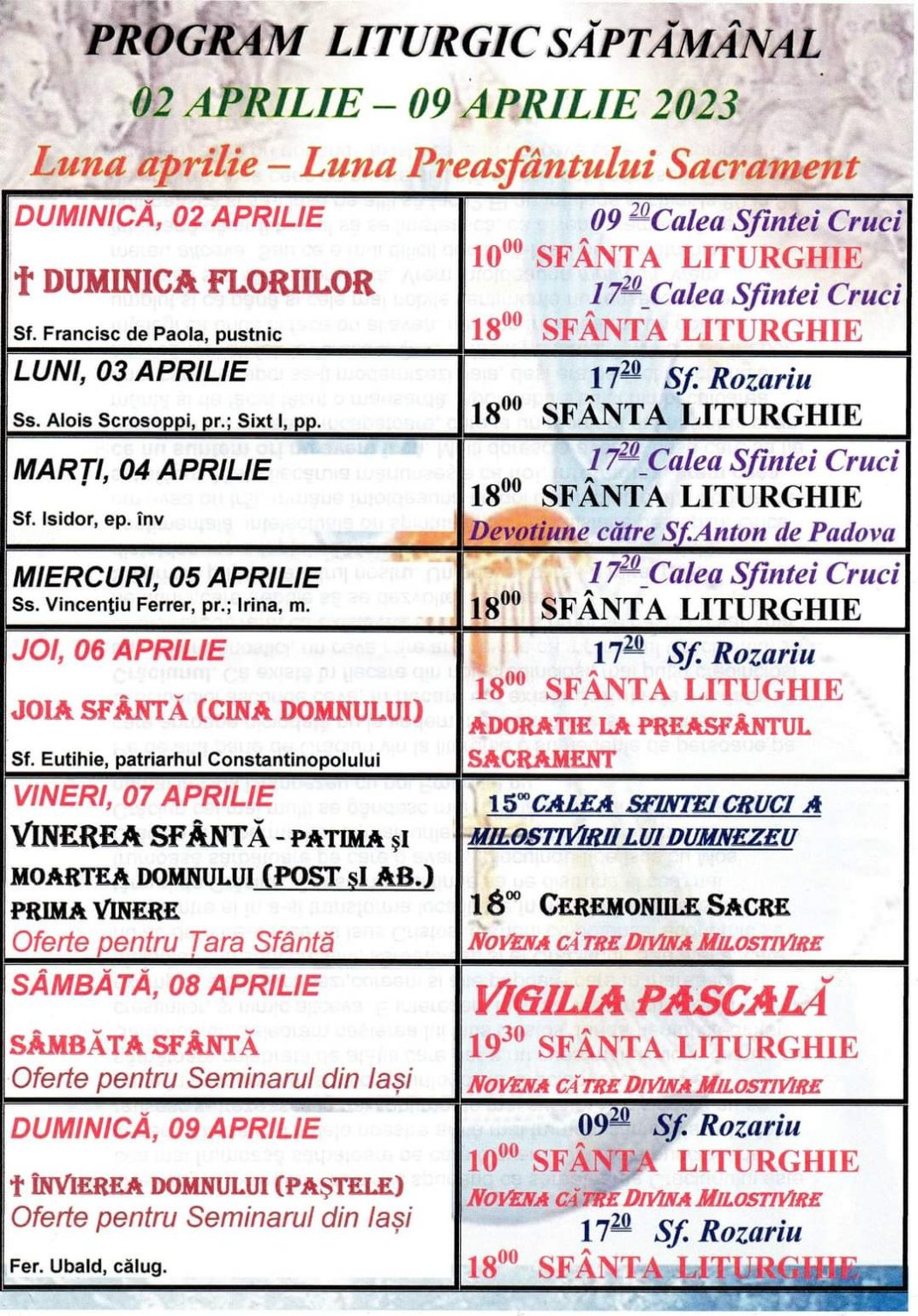 PROGRAMUL LITURGIC Parohia Sf. Francisc De Assisi Târgoviște 02 APRILIE – 09 APRILIE 2023