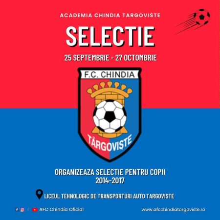 În perioada 25 septembrie - 27 octombrie, AFC Chindia Târgoviște organizează selecție pentru copiii născuți în anii: 2014, 2015, 2016 și 2017.