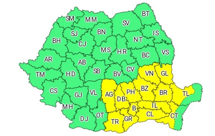 În Muntenia, sudul Moldovei și Dobrogea continentală vor fi perioade cu instabilitate atmosferică accentuată ce se va manifesta local prin intensificări ale vântului, vijelii (viteze la rafală de peste 60…70 km/h), descărcări electrice, averse ce vor avea și caracter torenţial și izolat grindină. Cantitățile de apă vor depăși pe alocuri 25…35 l/mp.