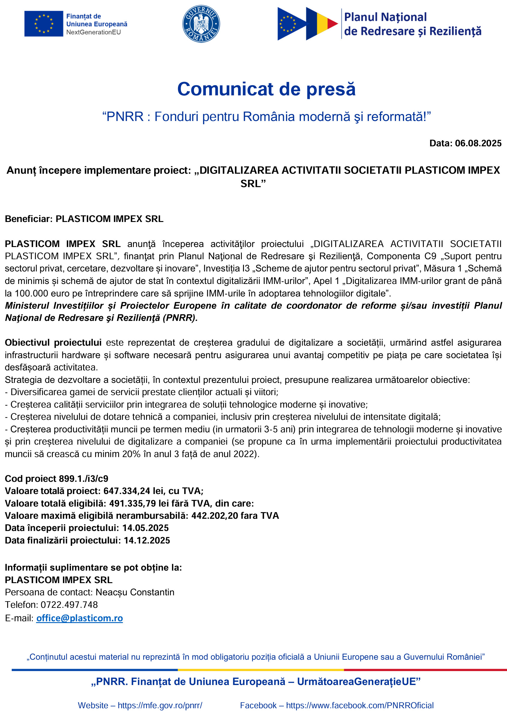 Anunț începere implementare proiect: „DIGITALIZAREA ACTIVITATII SOCIETATII PLASTICOM IMPEX SRL”8 august 2025