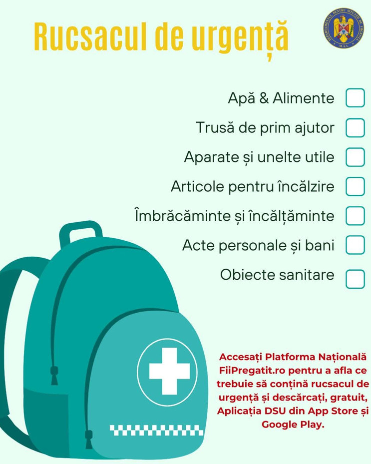 Autoritățile reamintesc populației că pregătirea rucsacului de urgență este esențială și poate face diferența în cazul producerii unei situații de urgență. Fie că este vorba despre un cutremur, inundații, incendii majore sau alte crize, rucsacul de urgență oferă posibilitatea supraviețuirii autonome timp de cel puțin 72 de ore, interval critic până la intervenția completă a echipelor de salvare sau la restabilirea serviciilor de bază.