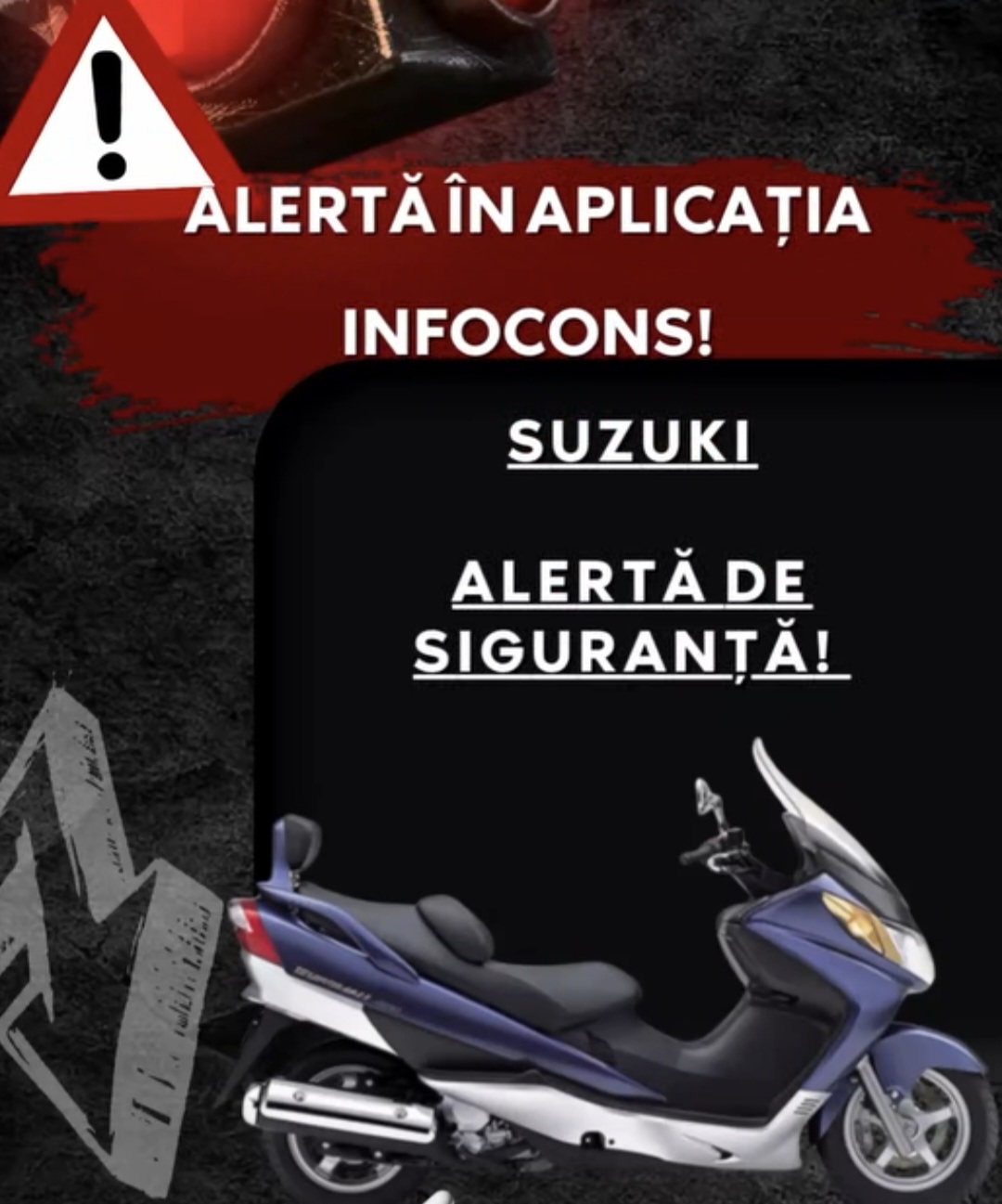 InfoCons lansează o alertă importantă pentru posesorii de motociclete Suzuki, după ce a fost identificat un defect tehnic care poate pune în pericol siguranța utilizatorilor.