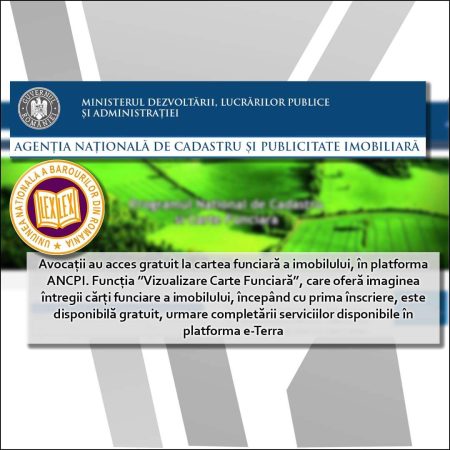 Serviciile din platforma e-Terra au fost completate cu noi produse. Astfel, avocații au acces gratuit la cartea funciară a imobilului, în platforma ANCPI fiind disponibilă gratuit funcția ’’Vizualizare Carte Funciară”, care oferă imaginea întregii cărți funciare a imobilului, începând cu prima înscriere, cu mențiunea ’’neutilizabil în circuitul civil’’.