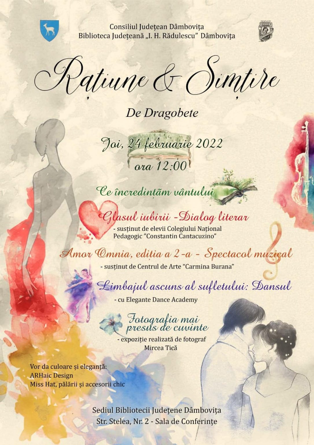 Joi, 24 februarie 2022, ora 12.00, Biblioteca Județeană „Ion Heliade Rădulescu” Dâmbovița vă invită să celebrăm Dragobetele, sărbătoarea iubirii la români, alături de partenerii noștri de la Colegiul Național Pedagogic „Constantin Cantacuzino”, Centrul de Arte „Carmina Burana” și „Elegante Dance Academy”, într-un ambient special conceput de ARHaic Design și Miss Hat, pălării și accesorii chic.