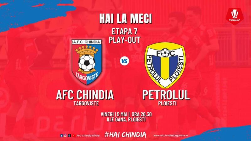 AFC Chindia Târgoviște pune în vânzare biletele pentru meciul cu Petrolul Ploiești, programat vineri, 5 mai, ora 20.30, pe stadionul Ilie Oană, în etapa a 7-a a play-out-ului Superligii.