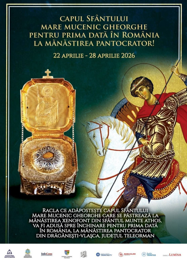 Un eveniment religios de mare însemnătate va avea loc în perioada 22–28 aprilie 2026, când Capul Sfântului Mare Mucenic Gheorghe va fi adus spre închinare la Mănăstirea Pantocrator.