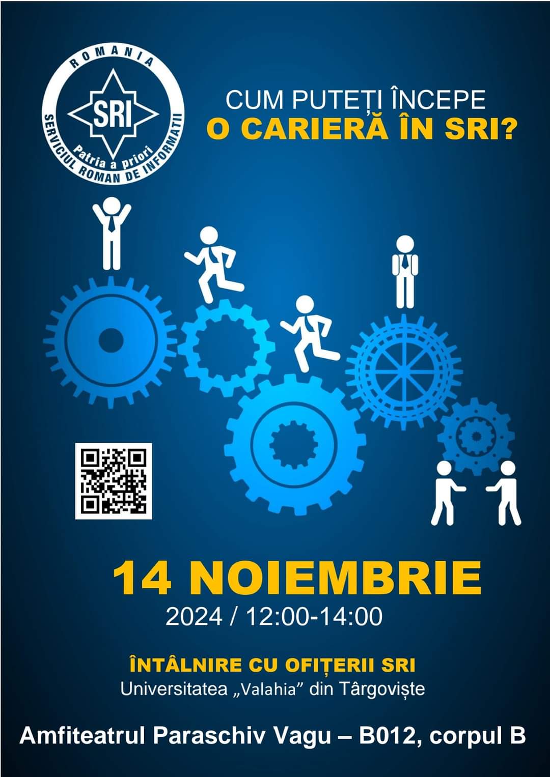 Dacă ești student și îți dorești o carieră provocatoare și importantă în domeniul securității naționale, Serviciul Român de Informații (SRI) te invită la un eveniment dedicat viitorilor profesioniști în domeniu. Evenimentul va avea loc pe 14 noiembrie 2024, între orele 12:00 și 14:00, la Amfiteatrul „Paraschiv Vagu” – B012, Corpul B, din cadrul Universității Valahia din Târgoviște
