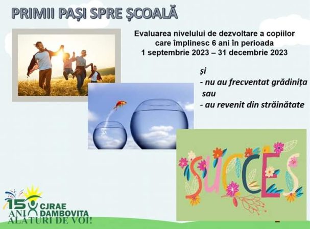 Începând din 05.04.2023, Centrul Județean de Resurse și de Asistență Educațională Dâmbovița  a organizat activitatea de evaluare a nivelului de dezvoltare a copiilor care împlinesc vârsta de 6 ani în perioada 1 septembrie-31 decembrie 2023 și urmează a fi înscriși în clasa pregătitoare, în anul școlar 2023-2024, dar nu au frecventat grădinița sau  au revenit din străinătate