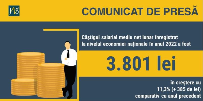 În cursul anului 2022, câştigul salarial mediu brut lunar a fost de 6.126 de lei, cu 10,7% (591 lei) mai mare faţă de anul anterior. În aceste condiţii, salariul mediu net lunar a fost de 3.801 lei, în creştere cu 11,3% (385 lei) faţă de 2021. Totodată, la finele anului 2022, efectivul salariaţilor a fost 5.607,1 mii persoane, cu 90,8 mii mai mare comparativ cu anul 2021.