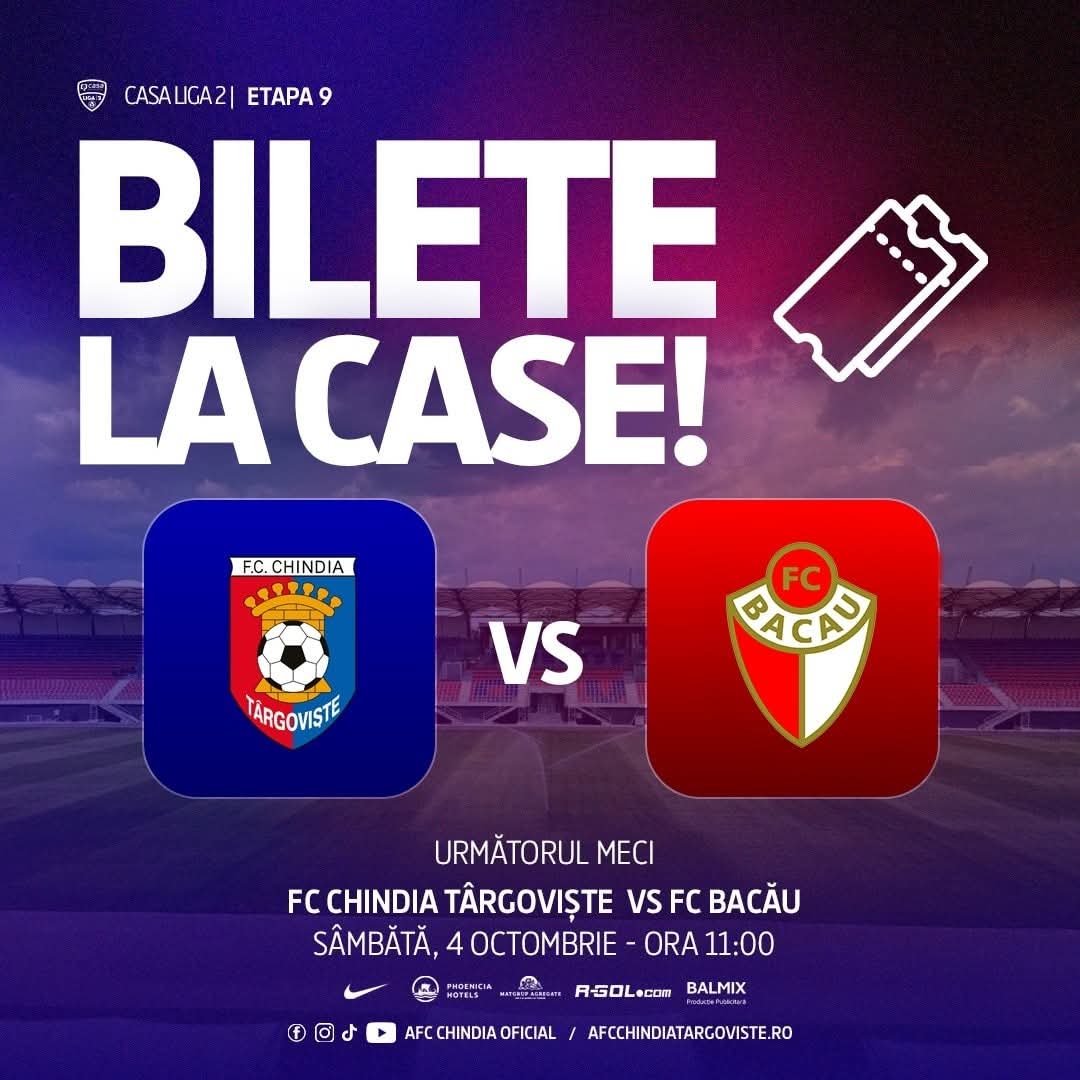 Fanii fotbalului din Târgoviște sunt așteptați pe Stadionul Eugen Popescu pentru partida Chindia – FC Bacău, programată sâmbătă, 4 octombrie, de la ora 11:00. Clubul a anunțat programul de vânzare a biletelor și detalii importante pentru accesul la stadion.