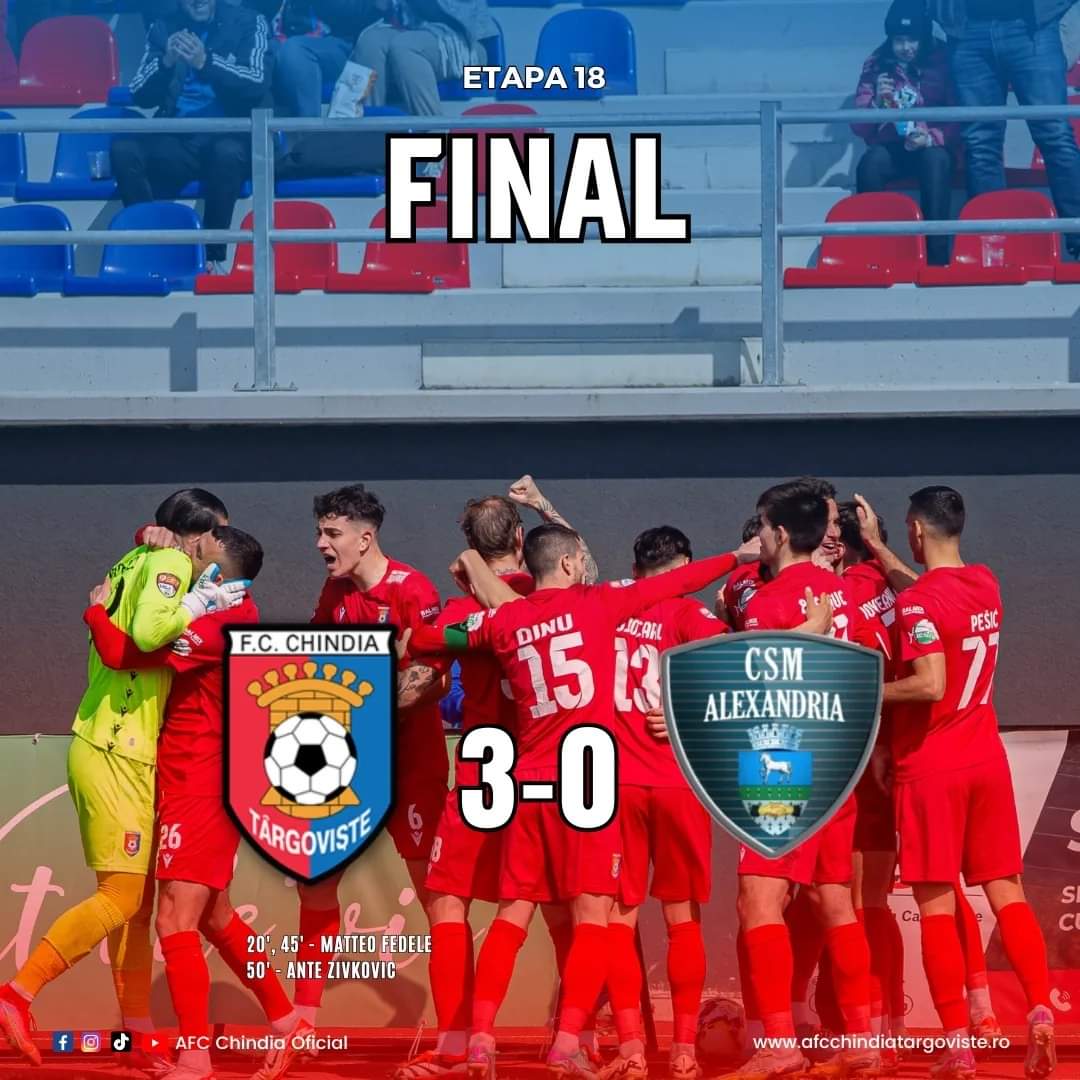 Chindia Târgovişte a învins CSM Alexandria, acasă, în etapa a 18-a, scor 3-0, penultima din sezonul regulat al Ligii 2.