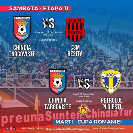 Chindia Târgoviște îi așteptăm în număr cât mai mare pe iubitorii fotbalul, la stadionul ” Eugen Popescu”  în etapa 11, la mediul Chindia Târgoviște vs CSM Reșița (28 octombrie ora 11:00) și la meciul contând pentru Cupa României-Grupe Chindia Târgoviște vs Petrolul Ploiești (31 Oct, ora 18:00)