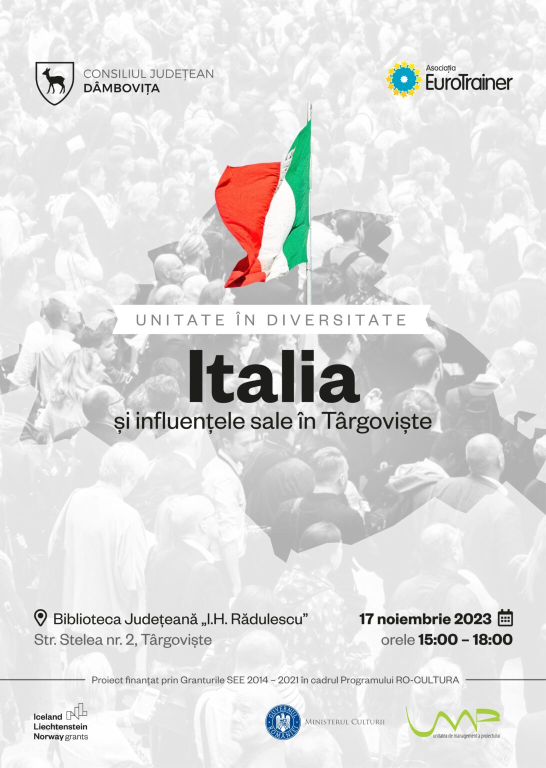 Toți cei interesați sunt așteptați  vineri, 17 noiembrie 2023, începând cu ora 15:00, la Biblioteca Județeană I. H. Rădulescu Târgoviște, pentru a participa la evenimentul dedicat Italiei și influențelor sale culturale asupra orașului Târgoviște.