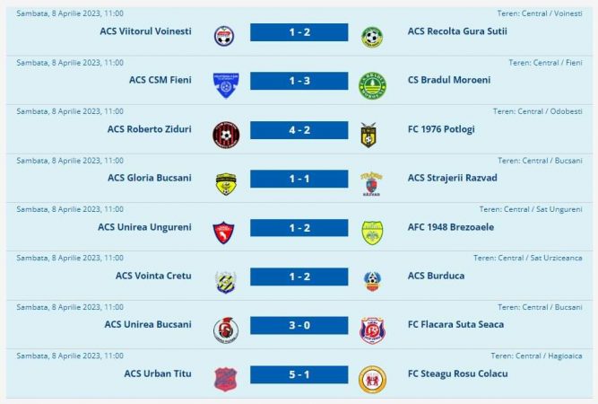 Ziduri, Unirea Bucșani și Titu au obținut victorie în meciurile susținute pe teren propriu, în timp ce Gura Șuții, Moroeni, Brezoaele și Burduca s-au întorc cu succese importante din deplasare. Gloria Bucșani și Străjerii Răzvad au făcut egal (1-1).