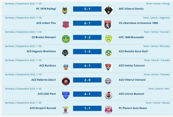 A fost o etapă dominată de gazde, care s-au  impus în șase partide, prin Potlogi, Titu, Moroeni, Burduca, Ziduri și Fieni. Doar Gura Șuții a câștigat  în deplasare, la Braniștea, în timp ce Șuța Seacă a plecat  neînvinsă de la Răzvad.