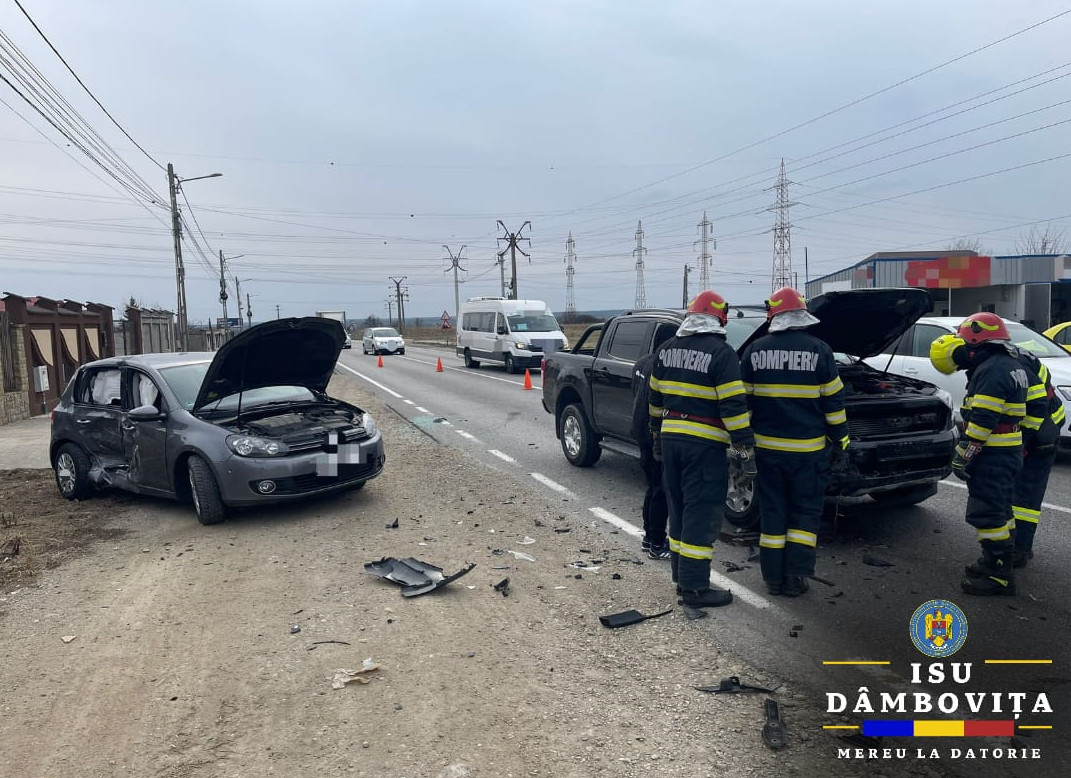 Joi, în jurul orei 14:04, pompierii au fost solicitați să intervină în cazul unui eveniment rutier în localitatea Dumbrava, pe DN 72 Târgoviște- Găești, unde au fost implicate două autoturisme.