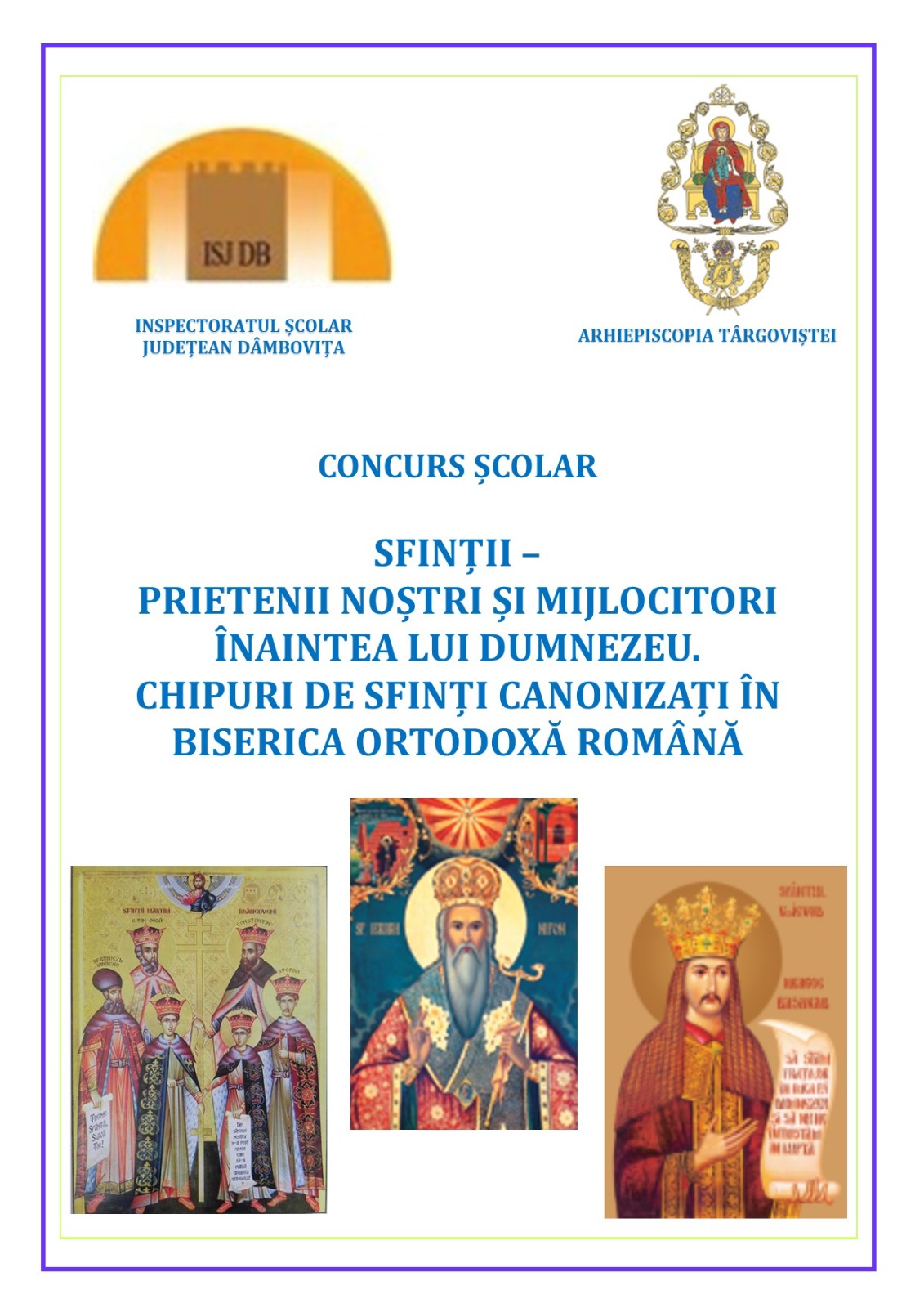 Concursul „Sfinții – prietenii noștri și mijlocitori înaintea lui Dumnezeu. Chipuri de sfinți canonizați în Biserica Ortodoxă Română” este organizat de Arhiepiscopia Târgoviștei, Asociația Profesorilor de Religie – filiala Dâmbovița, Societatea de Științe Istorice – filiala Dâmbovița și Seminarul Teologic Ortodox „Sfântul Ioan Gură de Aur” din Târgoviște, cu binecuvântarea Înaltpreasfințitului Părinte Arhiepiscop și Mitropolit Nifon și cu aprobarea Inspectoratului Școlar Județean Dâmbovița, înscriindu-se în seria de evenimente cultural-religioase organizate în Arhiepiscopia Târgoviștei cu prilejul Anului omagial al pastorației persoanelor vârstnice și Anului comemorativ al imnografilor și cântăreților bisericești (psalți).