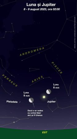 După ora 22:00, răsare Saturn și începând cu miezul nopții răsare și Jupiter.În nopțile de 12 și 13 august se poate vedea maximul curentului de meteori Perseide.Ca de obicei, în luna august își face apariția curentul de meteori Perseide.Denumite după constelația din care par că vin, Perseidele reprezintă unul dintre numeroasele roiuri de meteori activi într-un an. Perseidele sunt cunoscute pentru că este perioada concediilor și a vacanțelor, perioada din an când oamenii petrec mai mult timp sub cerul liber, noaptea.Fenomenul de stea căzătoare este arhicunoscut. Dâra luminoasă de pe cer este lăsată de o particulă sub 1 mm diametru care aprinde aerul, când intră în atmosfera Pământului. Pentru o fracțiune de secundă, vedem acest fenomen, denumit de astronomi meteor. Particula de praf cosmic care arde în atmosferă se numește meteoroid, iar pietroiul care uneori cade pe Pământ se numește meteorit.