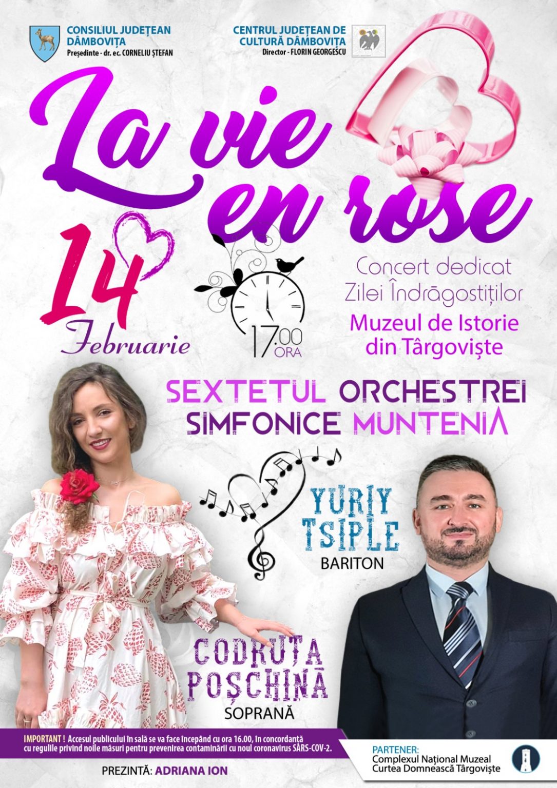 Astfel, vă invităm să luați parte la unul dintre cele mai frumoase momente artistice – ’’La vie en rose’’. Evenimentul este organizat de Consiliul Județean Dâmbovița, prin Centrul Județean de Cultură și va avea loc luni, 14 februarie, ora 17:00, la  Muzeul de Istorie din Târgoviște.