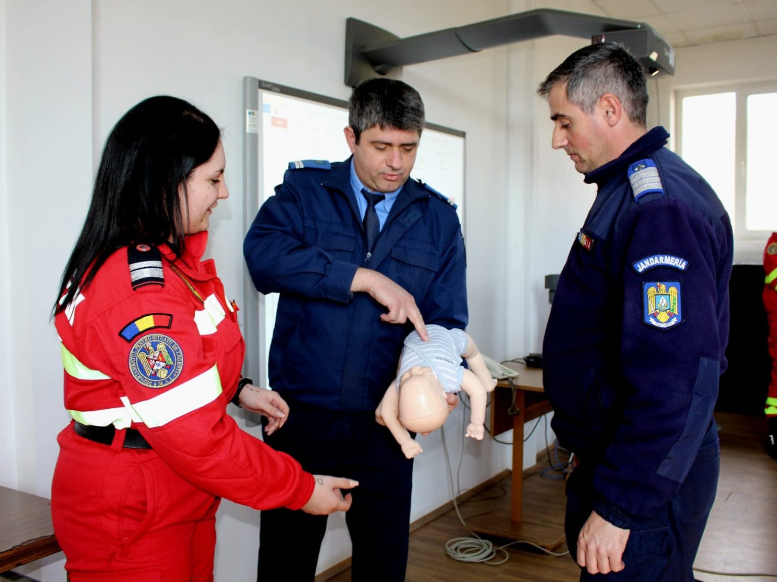 Pentru exemplificarea pașilor ce trebuie urmați în astfel de situații, coordonatorul SMURD a folosit manechine (adult și nou-născut), astfel încât fiecare jandarm participant să aibă ocazia de a exersa în condiții cât mai apropiate de realitate.