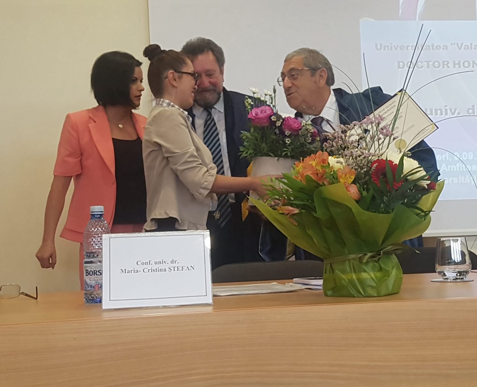 Comisia de analiză și evaluare privind acordarea titlului de Doctor Honoris Causa a avut următoarea componență: prof. univ. dr. Constantin Pehoiu – Președintele Senatului Universității „Valahia” din Târgoviște (președinte comisie), prof. univ. dr. Maria Negreponti Delivanis – Universitatea din Macedonia și vicepreședinte al Institutului CEDIMES Franța, prof. univ. dr. ing. Adrian Alexandru Badea – Președinte al Academiei Oamenilor de Știință din România, prof. univ. dr. Doina Banciu – Vicepreședinte al Academiei Oamenilor de Știință din România, prof. univ. dr. Claude Albagli – Președinte al Institutului CEDIMES Franța, conf. univ. dr. Maria-Cristina Ștefan – Decan al Facultății de Științe Economice.