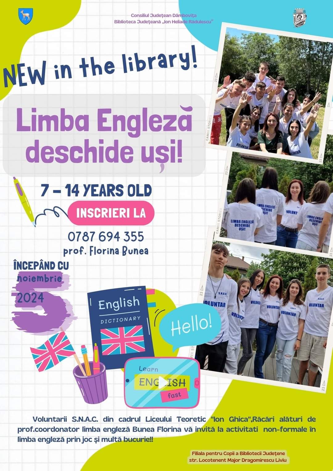 Biblioteca Județeană „Ion Heliade Rădulescu” Dâmbovița, în parteneriat cu voluntarii S.N.A.C. de la Liceul Teoretic „Ion Ghica” Răcari, anunță cu entuziasm deschiderea cursului interactiv „Limba engleză deschide uși!”, destinat copiilor. Acest program educativ se va desfășura săptămânal, pe o perioadă de un an, începând cu luna noiembrie, și va oferi tinerilor participanți ocazia de a învăța într-un mediu prietenos și stimulant.