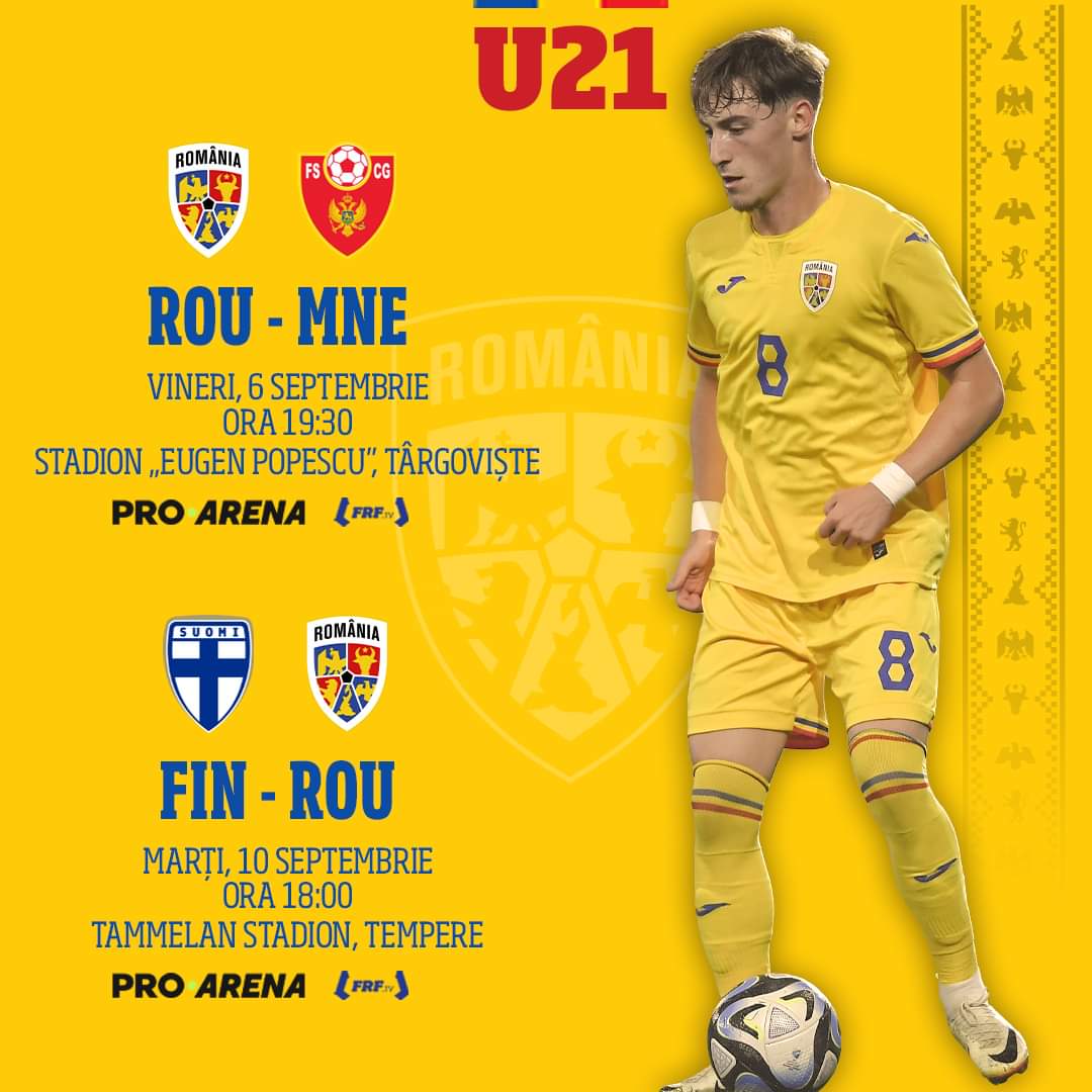 Echipa națională de fotbal U 21 a României continuă drumul către EURO 2025 cu două meciuri importante în luna septembrie. Tricolorii U21 vor disputa primul meci vineri, 6 septembrie, pe stadionul „Eugen Popescu” din Târgoviște, urmând ca peste 4 zile să întâlnească Finlanda, în deplasare, la Tempere.