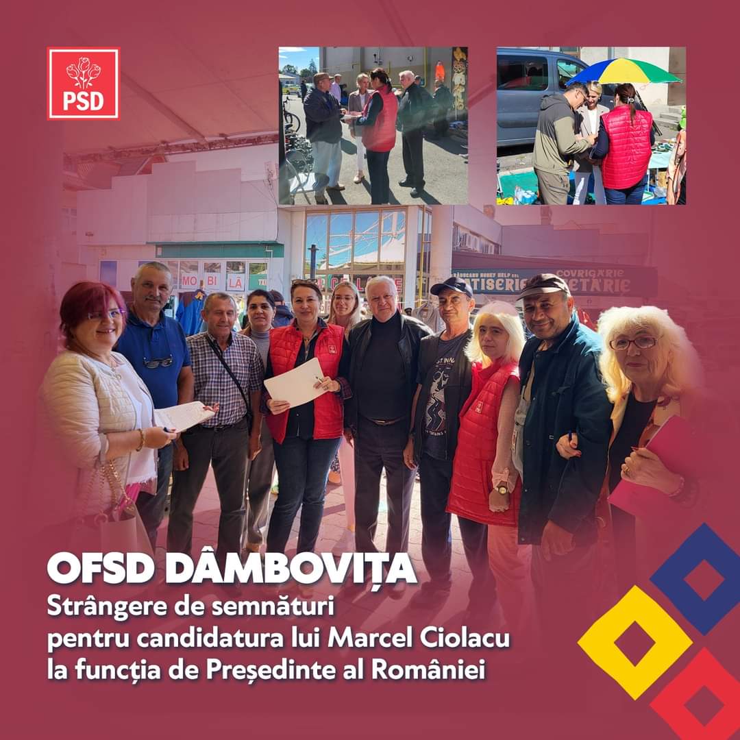 PSD Dâmbovița își arată zi de zi susținerea pentru candidatura lui Marcel Ciolacu la președinția României, subliniind nevoia de un lider care să reprezinte interesele tuturor românilor și să aibă experiența necesară pentru a implementa reformele de care țara are nevoie. Echipele partidului sunt implicate într-un dialog constant cu locuitorii din Dâmbovița, colectând semnături pentru susținerea lui Ciolacu. Aceste eforturi reflectă convingerea că alegerea sa în fruntea țării ar aduce o Românie a dialogului social, demnității și bunăstării.