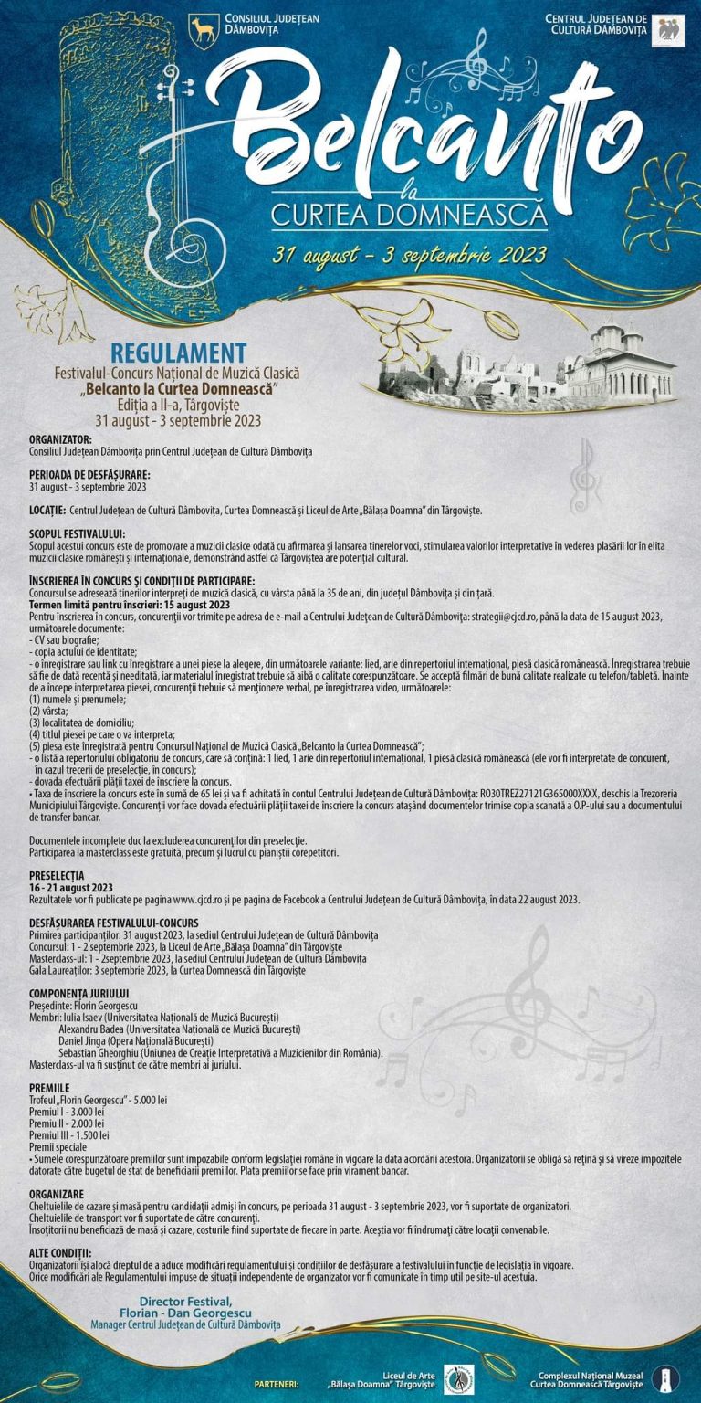 Consiliul Județean Dâmbovița, prin Centrul Județean de Cultură Dâmbovița, va organiza în perioada 31 august – 3 septembrie 2023, la Târgoviște  Festivalul–Concurs Național „Belcanto la Curtea Dombească”, un eveniment amplu destinat interpreților vocali.