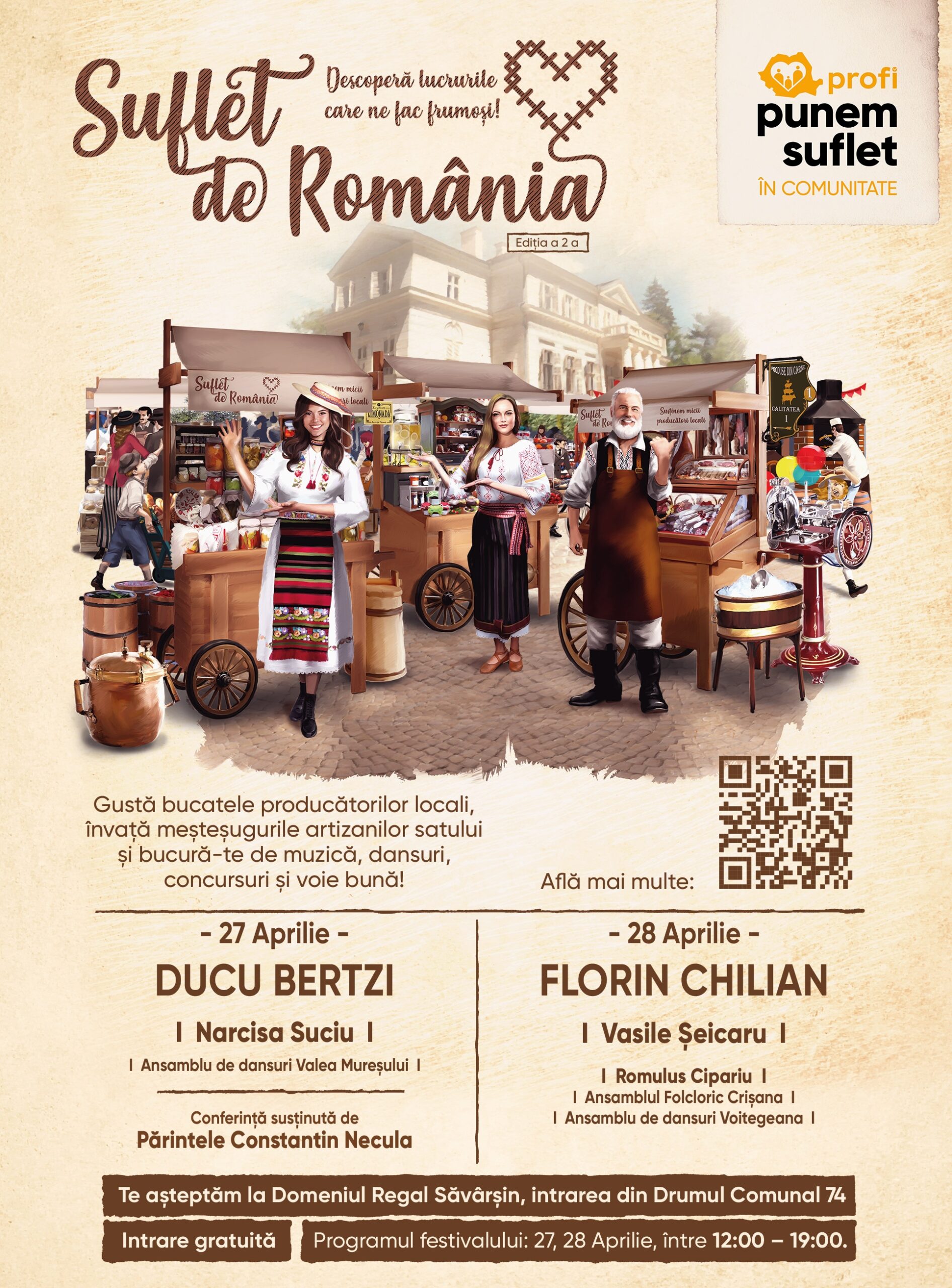 Evenimentul inițiat de Profi aduce la un loc mici producători locali, meșteșugari iscusiți, un cinematograf în aer liber cu filme românești, dansuri populare și concerte susținute, între alții, de Narcisa Suciu, Vasile Șeicaru, Ducu Bertzi și Florin Chilian. Participanții la a doua ediție a festivalului Suflet de România vor avea parte sâmbătă, 27 aprilie, de o întâlnire de suflet cu Părintele Constantin Necula.