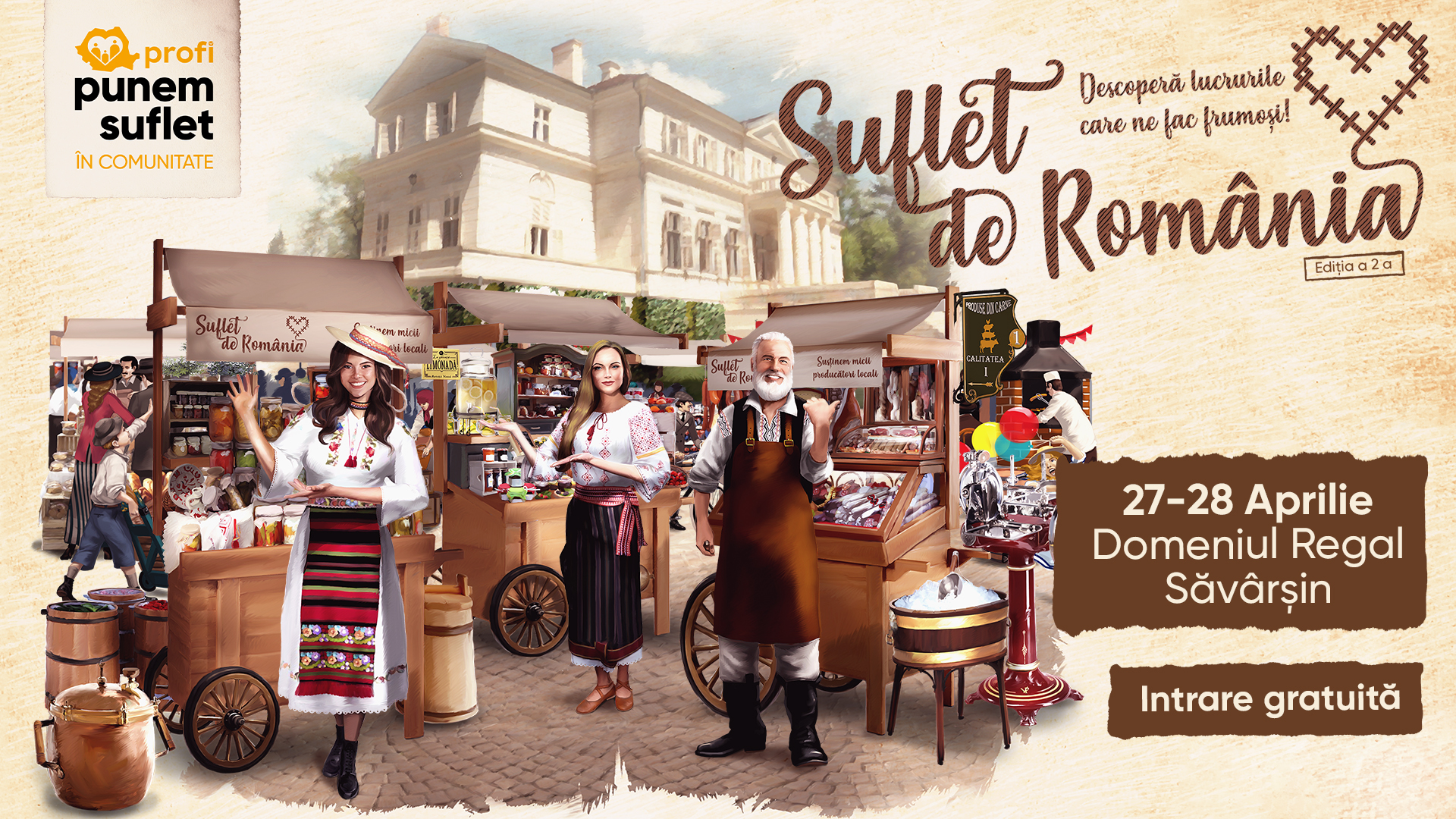 Pe 27 și 28 aprilie, între orele 12:00 – 19:00, festivalul Suflet de România oferă participanților ocazia să călătorească într-un sat atemporal, în vremea șezătorilor de altădată. În spațiul Domeniului Regal de la Săvârșin, în apropiere de Aleea Stejarilor Bătrâni, micii producători locali, susținuți de Profi, oferă spre vânzare produsele lor preparate tradițional, din ingrediente proaspete și sănătoase. Tot aici sunt deschise ateliere pentru toate vârstele, există experiențe pentru conectarea la satul românesc și valorile sale și sunt reunite mai multe organizații care, asemeni Profi, pun suflet în comunitate.