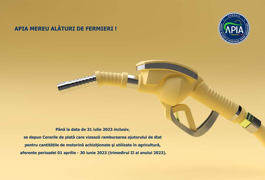 Agenția de Plăți și Intervenție pentru Agricultură (APIA) informează potențialii beneficiari că până la data de 31 iulie 2023 inclusiv, se depun Cererile de plată care vizează rambursarea ajutorului de stat pentru cantitățile de motorină achiziţionate şi utilizate în agricultură, aferente perioadei 01 aprilie – 30 iunie 2023 (trimestrul II al anului 2023).