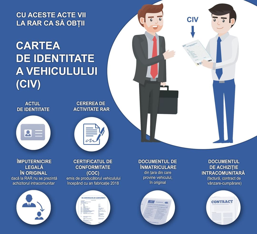 – documentul de achiziție intracomunitară (factură, contract de vânzare-cumpărare etc) în original sau sub forma unei copii în care toate datele sunt lizibile. Conform OUG nr.120/2021, obligativitatea solicitării și obținerii CIV de la RAR îi revine achizitorului intracomunitar, care poate cere eliberarea acestui document în mod direct sau printr-un împuternicit legal. În cel de-al doilea caz, este necesar să prezentați împuternicirea în original. Totodată, începând cu data de 25.07.2022, angajații Registrului Auto Român au obligativitatea de a scana și transmite în format digital documentul de achiziție intracomunitară către ANAF.