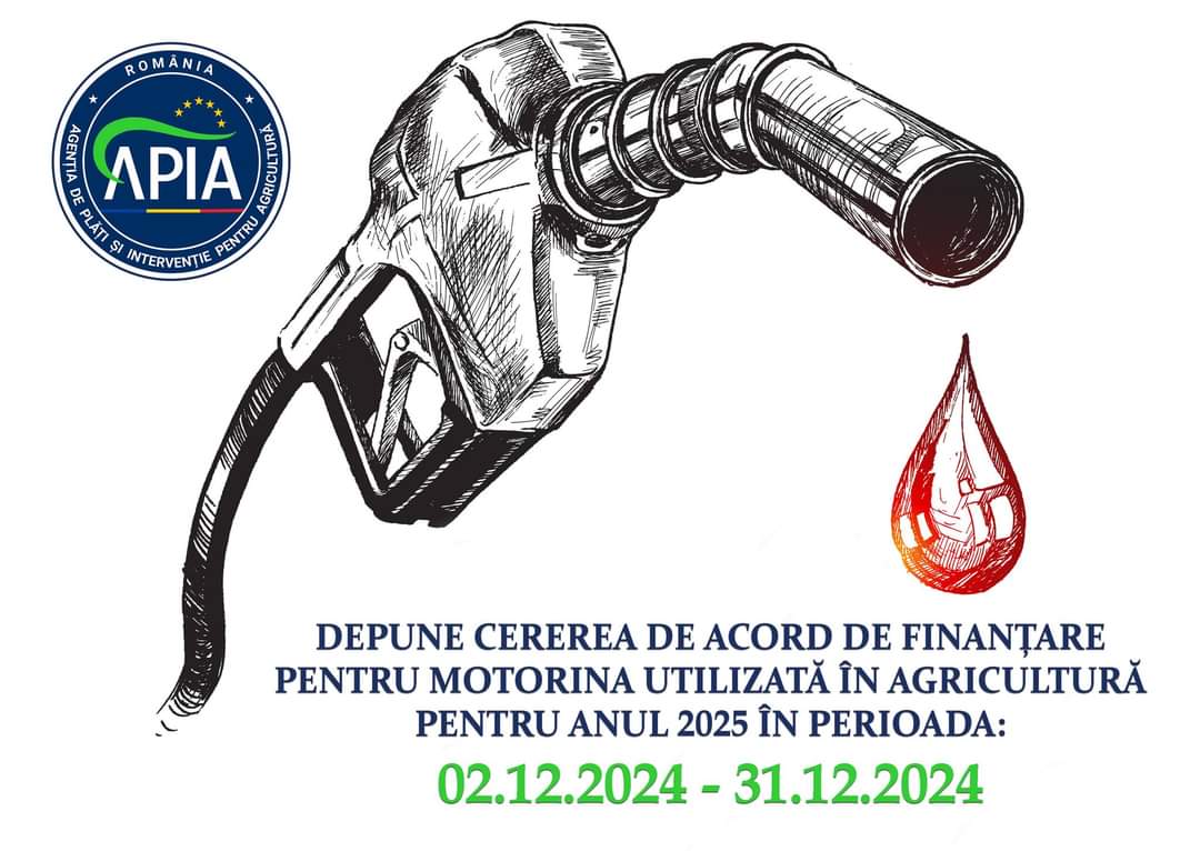 Agenţia de Plăţi şi Intervenţie pentru Agricultură (APIA) informează că în perioada 02 – 31 decembrie 2024 inclusiv, se depun Cererile de acord pentru finanţare aferente schemei de ajutor de stat pentru reducerea accizei la motorina utilizată în agricultură pentru anul 2025, astfel: