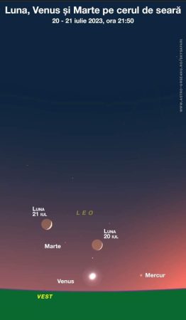 În serile de 19, 20 și 21 iulie Luna trece prin preajma planetelor Mercur, Venus și Marte.