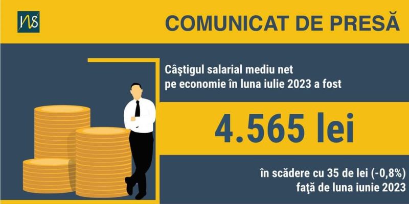 În luna iulie 2023,câştigul salarial mediu brut a ajuns la 7.317 de lei, cu 47 de lei mai puțin faţă de luna iunie, iar câştigul net s-a diminuat până la valoarea de 4.565 de lei, scăderea fiind de 35 de lei. Cele mai mari valori ale câştigului salarial mediu net în luna iulie s-au înregistrat în sectorul IT (10.584 de lei), iar cele mici în domeniul ospitalității (2.546 lei).