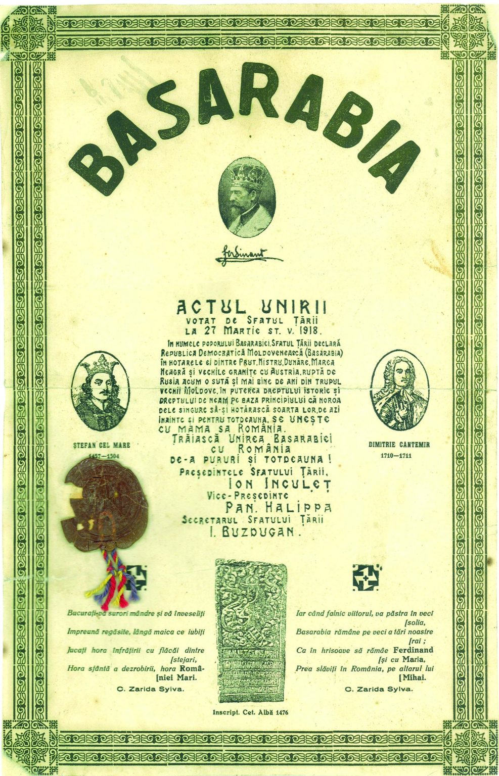 În telegrama trimisă de regele Ferdinand I Sfatului Ţării se arăta: ”Sentimentul naţional ce se deşteptase atât de puternic în timpurile din urmă în inimile moldovenilor de dincolo de Prut a primit prin votul înălţător al Sfatului Ţării o solemnă afirmare. Un vis frumos s-a înfăptuit”.