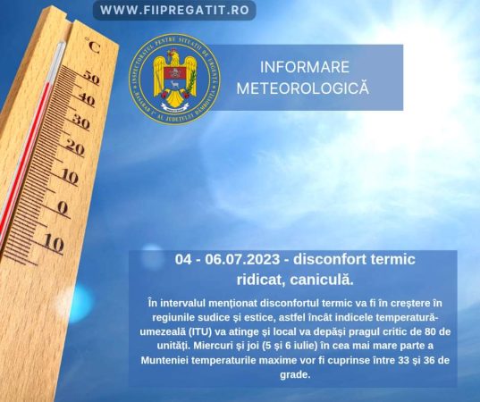 În intervalul menționat disconfortul termic va fi în creștere în regiunile sudice și estice, astfel încât indicele temperatură-umezeală (ITU) va atinge și local va depăși pragul critic de 80 de unități. Miercuri și joi (5 și 6 iulie) în cea mai mare parte a Munteniei temperaturile maxime vor fi cuprinse între 33 și 36 de grade.