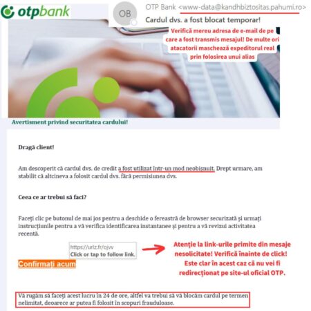 – E-mail-ul de pe care a fost transmis mesajul NU aparține OTP Bank (domeniul pahumi[.]ro)
