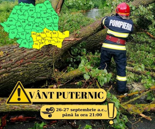 Miercuri 27 septembrie, vântul va avea intensificări temporare cu viteze de 55…65 km/h.