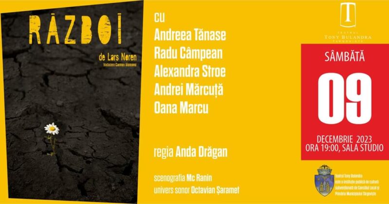La Teatrul Tony Bulandra din Târgoviște va avea loc spectacolul „Război”, pe 9 decembrie, de la ora 19:00, în Sala Studio, un spectacol atât de actual, încât îl simți pe piele, în minte și în suflet!