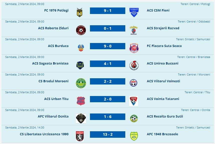 ACS Burduca și Străjerii Răzvad rămân în luptă directă pentru trofeu, în timp ce Potlogi, Braniștea, Titu, Urziceanca, Ziduri și Tătărani vizează ultimul loc pe podium.