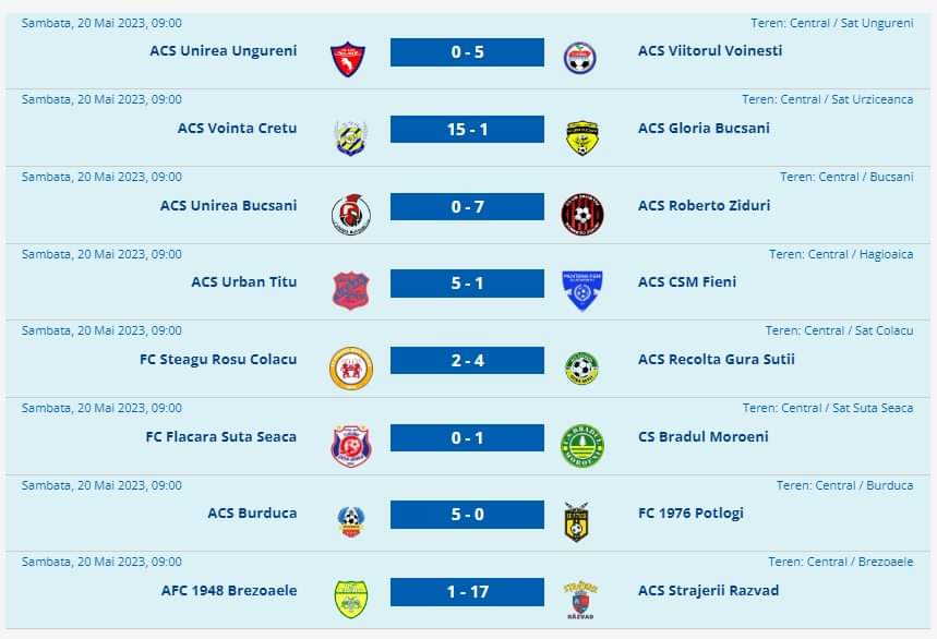 La seniori, Liga 4, rezultatele arată astfel: patru victorii ale gazdelor (Ungureni, Crețu, Unirea Bucșani și Titu) , trei remize (la Șuța Seacă, Burduca, Brezoaele) și un succes al vizitatorilor (Gura Șuții).