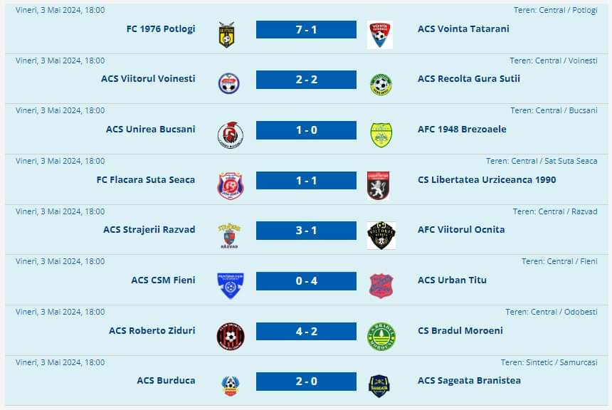 Etapa viitoare, sâmbătă, 11 mai, ora 11.00: Burduca – Potlogi, Braniștea – Ziduri, Moroeni – Fieni, Titu – Răzvad, Ocnița – Șuța Seacă, Urziceanca – Bucșani, Brezoaele – Voinești, Gura Șuții – Tătărani.