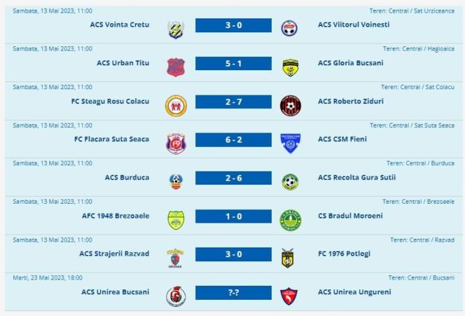 A fost o etapă cu cinci victorii ale gazdelor (Crețu, Titu, Șuța Seacă, Brezoaele și Răzvad) și două victorii ale oaspeților (Ziduri și Gura Șuții).