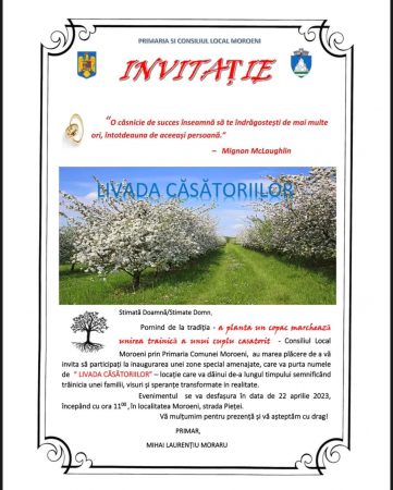 Este vorba despre un proiect de suflet, inaugurarea unei zone special amenajate în comuna Moroeni , care va purta numele de “Livada Căsătoriilor”, locație care va semnifica trăinicia unei familii, visuri și speranțe transformate în realitate. Un eveniment cu totul și cu totul deosebit ce se va desfășura în data de 22 aprilie, începând cu ora 11:00, la Moroeni, pe strada Pieței.