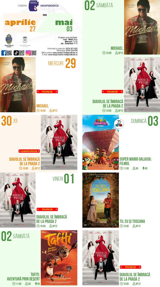 În perioada 29 aprilie – 3 mai, Cinema Independența își așteaptă spectatorii cu o selecție variată de filme, pregătită să transforme fiecare zi într-o experiență diferită. De la ritmuri antrenante și povești inspiraționale, până la aventuri spectaculoase și momente pline de sensibilitate, programul acestei săptămâni promite să cucerească publicul de toate vârstele.