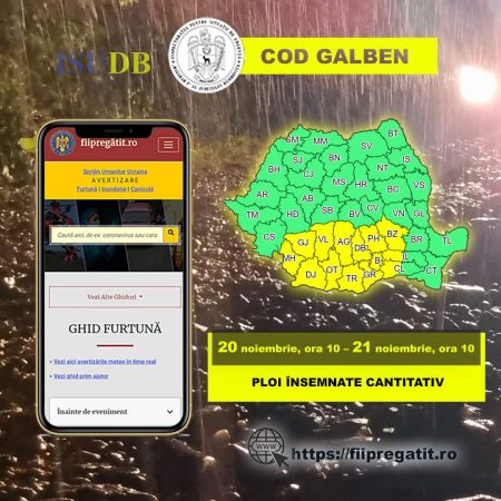 MOBILIZARE în Dâmbovița , a intrat în vigoare un COD GALBEN de ploi însemnate cantitativ și vânt ce vizează TOT județul Dâmbovița, de astăzi, 20 noiembrie și până mâine, 21 noiembrie ora 10, vor fi perioade cu ploi însemnate cantitativ care vor avea și caracter de aversă, iar cantitățile de apă vor depăși 25…35 l/mp și pe arii restrânse 50 l/mp.