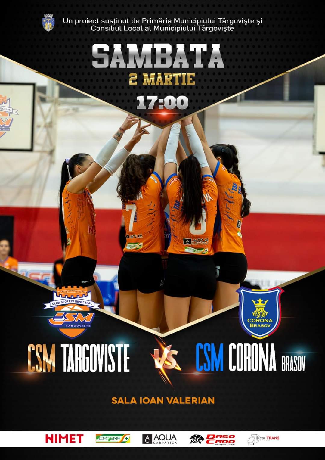 Nu ratați meciul CSM Târgoviște- CSM Corona Brașov, ce va avea loc sâmbătă, 2 martie, în Sala „Ioan Valerian” din Târgoviște.