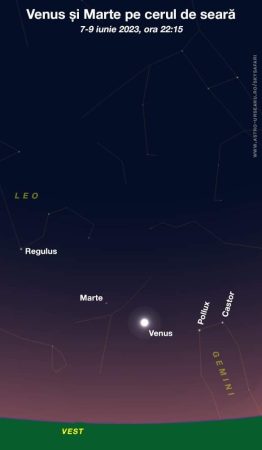 Pentru a le vedea pe Venus și Marte trebuie să priviți pe la ora 21:30-22 înspre vest. La început veți vedea un astru foarte strălucitor, care este planeta Venus.